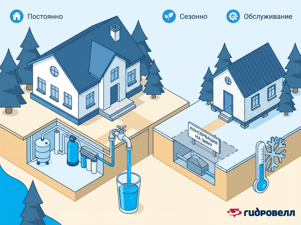 Для дачи всё иначе. Часто это сезонное проживание, перепады давления, риск заморозки. В таких случаях мы заранее закладываем возможность обслуживания и сезонной консервации, чтобы оборудование спокойно пережило зиму.